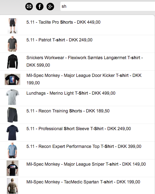 - Predictive “live-search” results. (In the example to the right “sh” is typed in the search box, and we are already seeing shorts and shirts.)